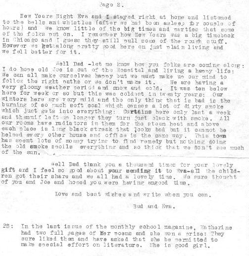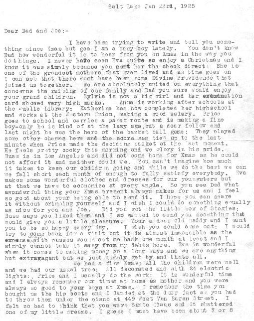 An excellent newsy letter summarizing each of children's activities, weather, pollution, financial status, and conservative life style in the midst of the Roaring Twenties.