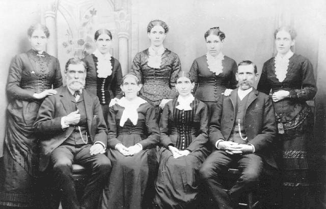 Back: L.-R: Urmina Griffeth (Hyde), Louisa Griffeth (Seamon), Marinda Griffeth (McOmber, Clark), Lovina Griffeth (Thurman), Mary Griffeth (Hyde). Front: L-R: Patison D. Griffeth (Father) with his wife Elizabeth C. Griffeth, Phoebe Griffeth Hyde, and George Andrew Griffeth. The names of the children not shown from Sarah are: Sarah, William, Charles, Susan, Eleanor, Edgar, Ancil, Eva, and Ina. Sarah was his second wife and their family lived in Fairview, Idaho. They were the first white settlers there. Due to U.S. marshal raids on polygamist families, Patison took Sarah to Idaho and Star Valley, Wyoming, where they became the very first settlers and pioneered the areas. It was a good cold place to get out of reach from the marshals.