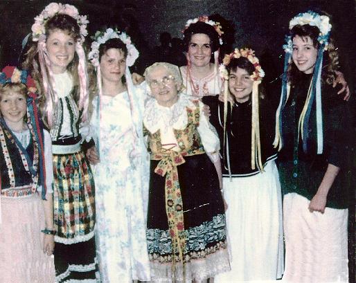 The Czech mission was reopened after 40 years behind the iron curtain. President and sister Richard Winder presided 1991. Left to Right: Mary, Julie, Megan, Frances, Ruth, Karen, and Monica. We sang: I am a Child of God in Czech for the program. We presented Sister Barbara Winder with a Czech head-dress of flowers & ribbons. It was a wonderful time of rejoicing for the long wait to see the Czech mission re-open.