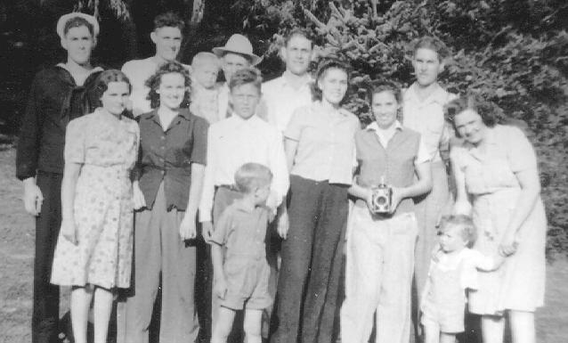 L-R: Back: Ferryle, David, Grandfather Calvin D McOmber holding Calvin III, Arthur, Front: L-R: Frances, Stout Cousins, Velma (4th from end), ?, Aunt June with Art.