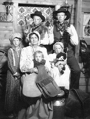 Pioneer dress-ups at the Lagoon resort in Farmington, Utah L-R: front: Julie, Ruth with baby Jared, Mary with doll, Back: John Calvin, and dad John (Fun memories at Lagoon)