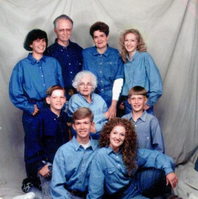 Back: L-R: Eva P.from Czech Republic, John (Dad), Ruth (Mom), and Mary Center: L-R: Jared, grandma Frances B. McOmber, and Joseph Front: John Calvin, and Julie Kay