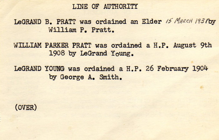 Scan of both sides of a 3x5" index card still in my position which I received when I had the higher priesthood conferred on me and was ordained an elder in the LDS Church by my father LeGrand B. Pratt on Sun 13 Jun 1965.